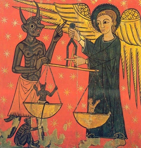 “Weighing of Souls” (psychostasis), Master of Soriguerola, altar side panel, late 13th century, tempera on panel. Episcopal Museum of Vic (MEV), inventory MEV 9694.